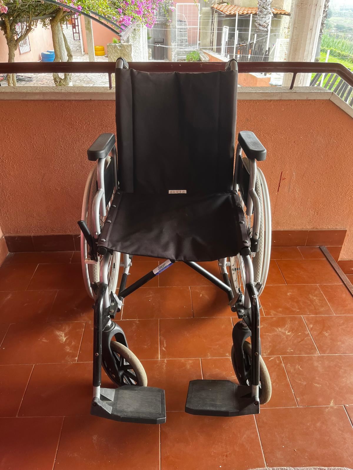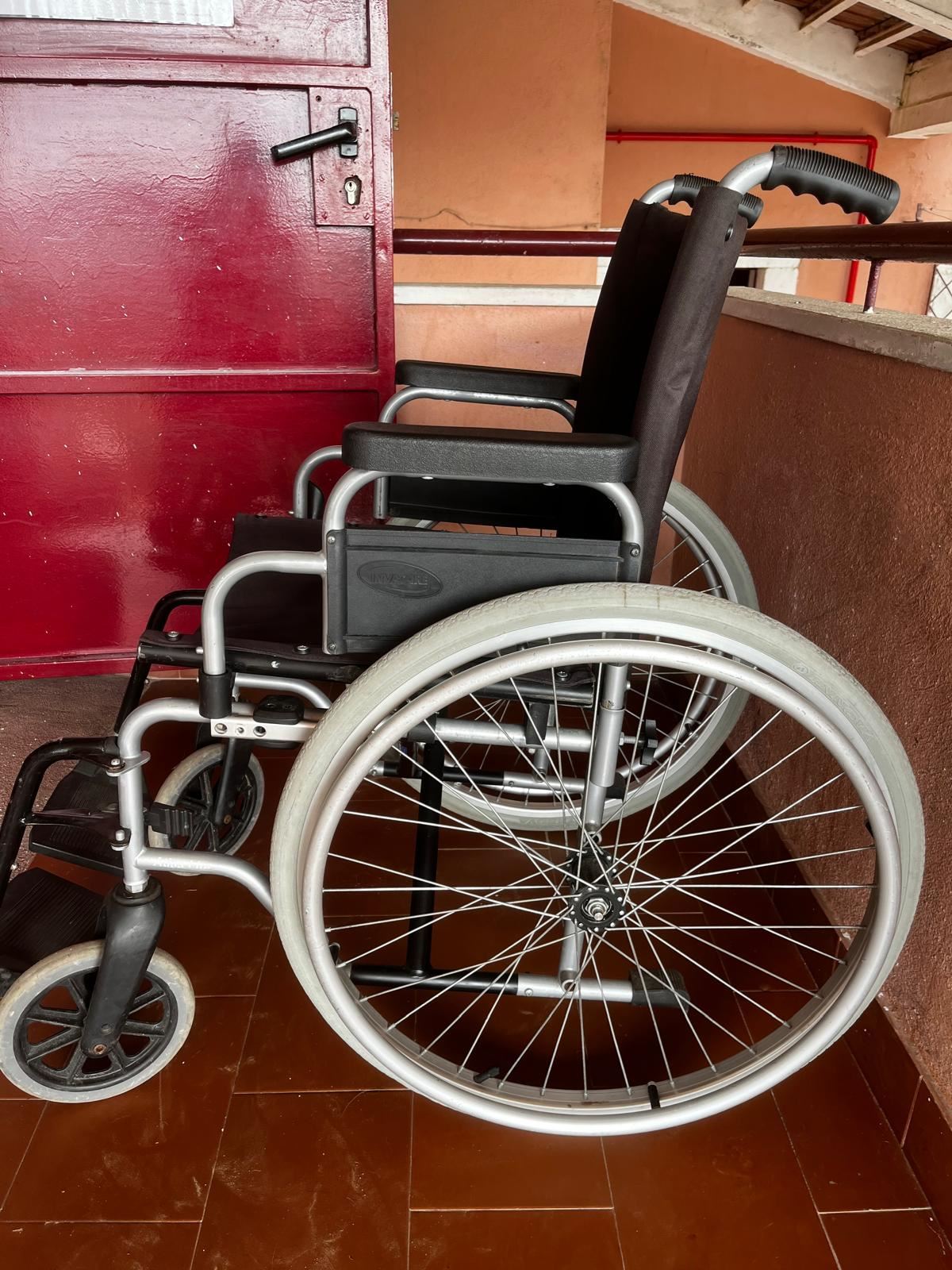 Cadeira de rodas manual Invancare. dobrá-se para facilitar transporte e armazenamento. Têm 2 apoios de pés e apenas um travão na roda direita.